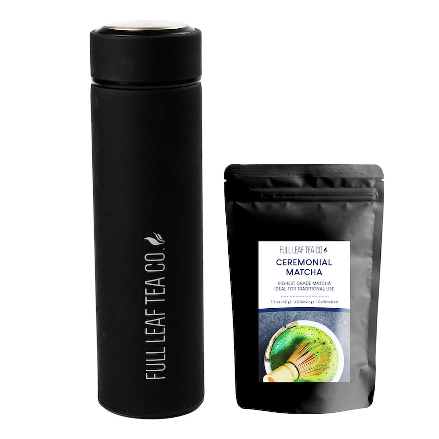 Make matcha quickly and easily with this exclusive matcha set! Our Matcha On-The-Go Tea Set includes a 1.5 oz bag of matcha and a Vacuum Flask Infuser Bottle. Choose between either Ceremonial Matcha or Organic Premium Matcha, and use the bottle to quickly brew a perfect cup of matcha. Add a scoop of matcha to the bottle, pour in your desired amount of hot or cold water, push the infuser back in place at the top of the bottle, and then shake the bottle until the matcha becomes frothy. Instant matcha! Made of stainless steel, the Vacuum Flask Infuser Bottle is perfect for hot or iced loose leaf tea or matcha. It keeps your drink at the perfect temperature for hours! Product dimensions for the flask are 8.75" in height by 2.5" in circumference.